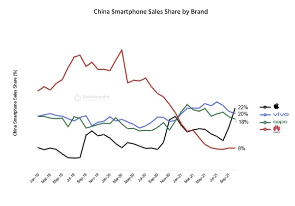 그는 “지난달 애플이 2015년 12월 이후 처음으로 새로운 1위 스마트폰 제조사가 되면서 시장 판도가 다시 바뀌었다. 중국에서 아이폰13 시리즈가 아이폰12 시리즈보다 저렴하게 출시된 것이 주효했다”고 말했다.