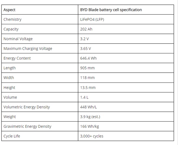 BYD 블레이드 배터리는 사양에 있어서도 타협이 없다. 싱글셀 디자인은 길이 37.7인치(96cm), 너비 3.5인치(9cm), 높이 1.35cm로 컴팩트하다. 싱글셀들은 어레이에 놓이고, 블레이드형 배열로 팩에 삽입된다. 이 배열은 3000회 충방전 사이클로 120만km(74만 마일) 이상의 주행거리 수명을 가능케 해 준다.