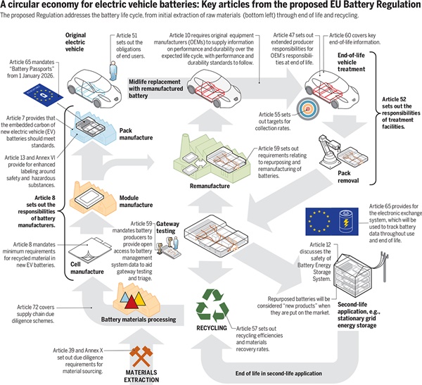 ▲처리 및 재활용=수거된 폐배터리는 매립 또는 소각이 금지되며 재활용 프로세스에 들어가야 한다. 재활용자는 반드시 각 재활용 프로세스가 새배터리 규정 부속서 12에 명시된 최소한의 재활용을 달성할 수 있도록 보장해야 한다.