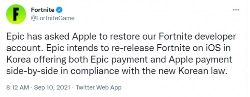 9일(현지시간) 에픽게임즈는 포트나이트의 공식 트위터 계정을 통해 "저희 에픽게임즈는 애플에게 우리의 포트나이트의 개발자 계정을 복원해 달라고 요청했습니다"라고 알렸다. 더불어 "한국의 새로운 법을 준수하기 위해 애플의 인앱 결제 방식과 에픽 결제를 모두 나란히 제공하는 형태로 포트나이트를 iOS에서 재출시할 계획입니다"라고 밝혔다.