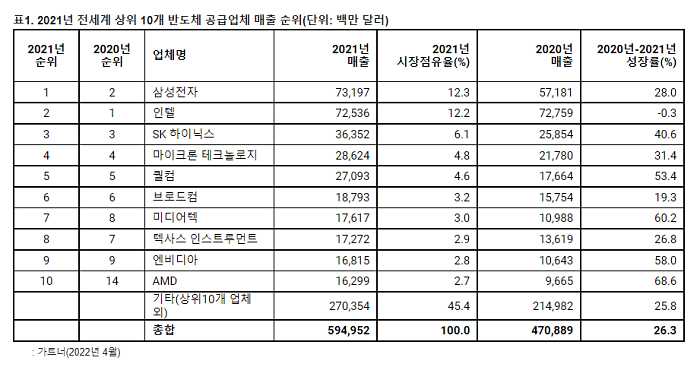 반면, 인텔은 매출 725억달러(약 89조원)에 시장점유율 12.2%, 전년 대비 성장률은 -0.3%를 보이며 삼성전자에 선두 자리를 내줬다. 인텔 다음으로 SK하이닉스가 시장점유율 6.1%를 기록하며 3위를 차지했다. 매출은 363억달러(약 44조6600억원)로 전년 대비 성장률은 40%를 넘었다.