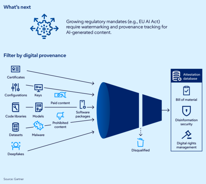 '디지털 출처증명'은 소프트웨어·데이터·AI 생성 콘텐츠의 출처와 무결성을 검증하는 체계다. 오픈소스 코드 변조, 딥페이크 사기 등이 늘며 중요성이 커지고 있다. EU AI Act 같은 규제는 AI 생성물에 워터마킹과 출처 추적을 의무화하는 방향으로 가고 있어, 2029년까지 투자하지 않은 기업은 수십억 달러 규모 제재 위험에 직면할 수 있다고 가트너는 경고했다.
