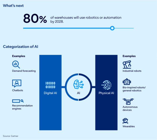 '피지컬 AI'는 로봇·드론·산업 장비 등 물리 세계에서 '감지-판단-행동'을 수행하는 AI를 말한다. 디지털 AI가 수요 예측이나 챗봇 같은 온라인 작업을 했다면, 피지컬 AI는 실제 현장의 물리적 작업을 자동화한다. 가트너는 2028년까지 창고의 80%가 로봇 시스템을 도입하고, 상위 10대 AI 벤더 중 절반이 피지컬 AI 제품을 내놓을 것으로 봤다.