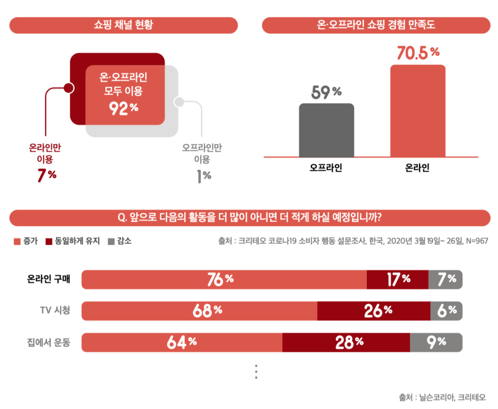 코로나19 이후 이커머스 시장은 단순히 매출 규모만 증가한 것이 아니었다. 닐슨코리아에 따르면 2020년 온라인 채널 이용자 중 31%가 신규 유입되었으며, 크리테오의 조사에서는 한국 소비자들의 76%가 온라인 소비를 늘렸다고 응답한 것으로 나타났다.