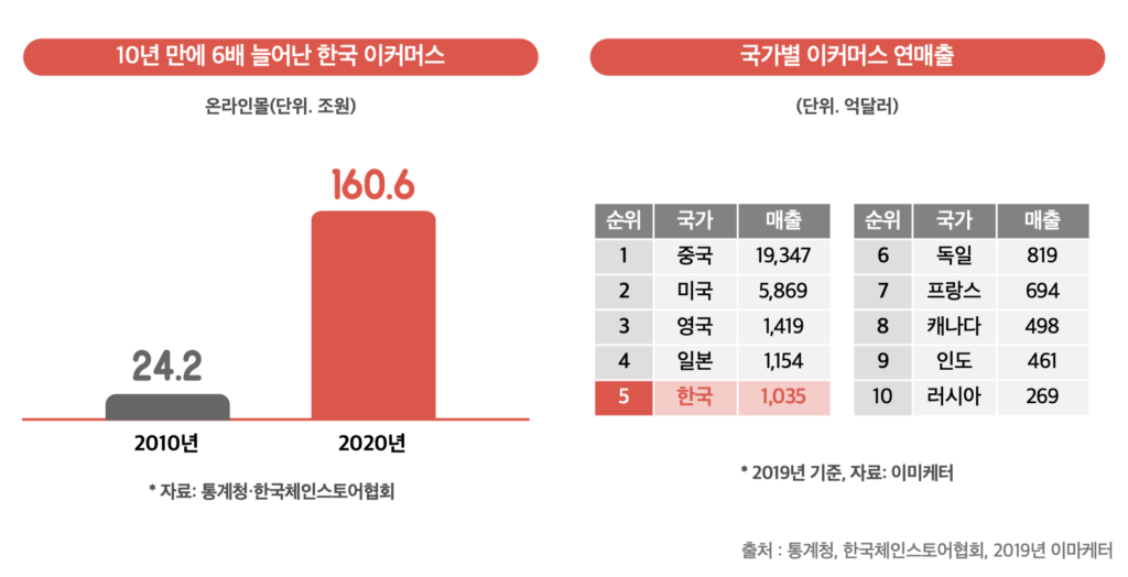 이커머스(전자상거래) 시장이 빠르게 성장하고 있다. 코로나19로 오프라인 매장 구매가 줄고 온라인 쇼핑이 습관화되면서, 2020년 글로벌 이커머스 시장 성장률은 예상치인 16.5%를 넘어 27.6% 성장을 기록했다. 거래 규모는 무려 4조 달러 이상을 달성한 상황이다. 국내 이커머스 시장의 성장세도 대단하다. 통계청 기준으로 2020년 국내 이커머스 시장은 전년대비 19.5%가 증가한 160조 원의를 매출 규모를 형성했는데, 이는 ‘글로벌 이커머스 HOT 리포트’에 따르면 세계 5위에 해당하는 규모이다.