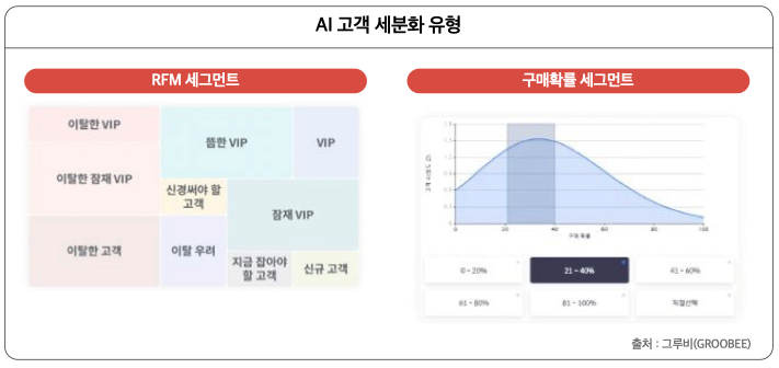 AI기반의 고객 세그먼트는 대표적으로 ‘RFM’ 모델을 적용한 세그먼트와 ‘구매 확률 예측’ 세그먼트가 많이 쓰인다. 고객과 자사몰의 관계를 지속적으로 체크할 수 있는 ‘RFM(RecencyᆞFrequencyᆞMonetary) 세그먼트 모델’은 매우 유용하며 널리 알려진 방법으로 고객의 최근 방문(Recency), 방문 빈도(Frequency), 구매 금액(Monetary)에 따라 고객을 분류하는 방식이다. RFM을 이용해 이탈 고객과 충성고객 등 다양하게 세분화된 AI 기반 알고리즘을 적용하면 고객과의 관계가 어떤 상태인지 빠르게 파악해 타겟팅 할 수 있다.