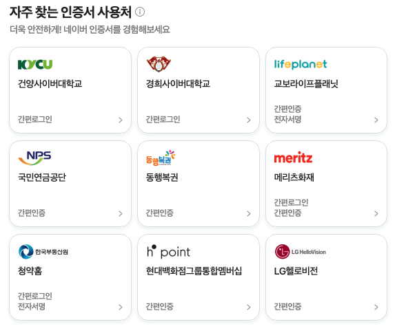 이제 네이버 인증서를 통해 국민건강보험공단과 서울시 인터넷납부시스템(ETAX)이 가능해졌으며, 향후 행정서비스통합포털 '정부24'와 지방세 신고·납부시스템 '위택스', 국세청의 '홈택스', 경찰청 '범죄경력회보서 발급시스템', 보건복지부의 복지포털사이트인 '복지로' 등 30개 주요 공공 웹사이트에도 활용처가 늘어날 예정이다. 네이버 측 올 연말까지 55개로 확대된다고 밝혔다.