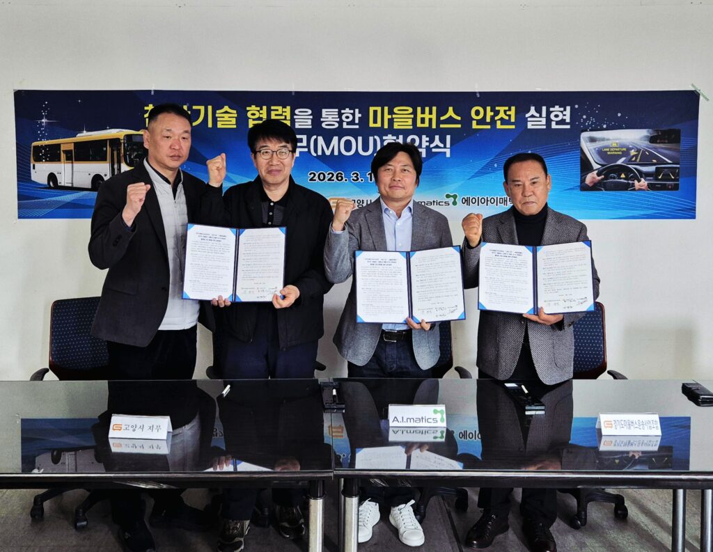 드림텍 자회사이자 AI 전문기업 에이아이매틱스는 경기도마을버스운송사업조합, 고양시 지부와 업무협약을 맺고 마을버스 운행 과정의 사고 예방과 안전관리 고도화에 나선다고 22일 밝혔다.