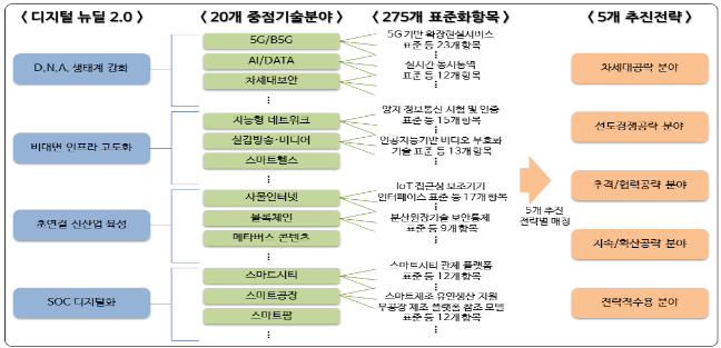 특히 올해는 ‘디지털 뉴딜 2.0 정책’(’21.7월)과 연계를 강화하기 위해 △데이터·네트워크·인공지능(D.N.A.) 생태계 강화, △비대면 인프라 고도화, △초연결 신산업 육성, △사회간접자본(SOC) 디지털화 등 4대 핵심 전략과 연관성이 높은 20개 정보통신(ICT) 핵심 기술 및 융합서비스 분야를 중점분석 대상으로 선정했고, 선정된 중점분석 대상에 대한 455개 표준화 항목을 도출하였으며, 이중 선제적 대응이 필요한 275개 표준화 항목에 대해 국제표준화추진전략을 설정했다.
