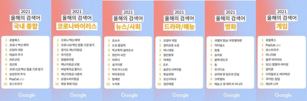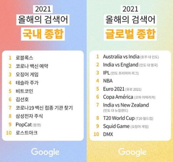 2021년 국내 검색어 종합 순위는 1) 로블록스 2) 코로나 백신 예약 3) 오징어 게임 4) 테슬라 주가 5) 비트코인 6) 김선호 7) 코로나19 백신 접종 기관 찾기 8) 삼성전자 주식 9) PopCat(팝캣) 10) 로스트아크 순으로 나타났다.