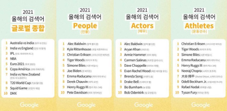 국내 종합 3위인 ‘오징어 게임’은 글로벌 종합 순위에서도 9위에 안착하며 K-콘텐츠의 전 세계적인 인기를 입증했다. 종합 순위에서는 전반적으로 스포츠 관련 검색어의 높은 인기가 두드러졌다. 특히 올해 치러진 크리켓 T20 월드컵 대회 경기인 ‘호주 대 인도’가 1위, ‘인도 대 영국’이 2위에 올랐으며, 인도의 프로 크리켓 리그 ‘인도 프리미어 리그’가 3위를 차지해 크리켓 경기에 대한 높은 관심이 드러났다. 또한 ‘인도 대 뉴질랜드’와 ‘T20 월드컵’이 7위와 8위에 자리했다. 이 밖에도 4위에 ‘NBA’, 5위에 ‘유로 2021’, 6위에 ‘코파 아메리카’가 오르며 다양한 스포츠 종목이 종합 검색어 순위에 올랐다. 올해 사망 소식으로 전 세계 팬들의 안타까움을 자아낸 미국 래퍼 ‘DMX’는 10위를 기록했다.
