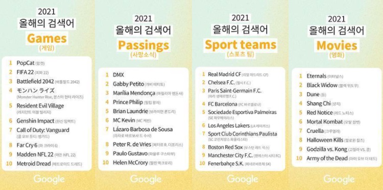 이 밖에 배우 ‘김선호’가 6위에 올랐고, 트위터 기반 국가별 경쟁 게임인 ‘PopCat(팝캣)’이 9위, 올해 선보인 업데이트 이후 이용자 수가 큰 폭으로 증가한 ‘로스트아크’가 10위를 차지했다.