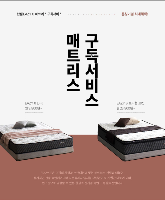 한편 국내 대형 가구 업체 중 한 곳으로 손꼽히는 한샘은 카카오톡과 손을 잡고 올해부터 매트리스를 제공하는 구독서비스를 진행하고 있다. 이러한 가구 구독 서비스는 이미 해외에서는 ‘페더’ ‘카사원’ 등의 사례가 다수 있다. 한샘은 매트리스를 시작으로 향후 침대, 쇼파 등으로 구독 서비스 품목을 확장할 계획이다.