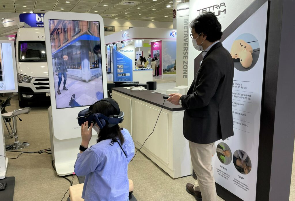 테트라시그넘은 AI 강사와 심폐소생술 교육을 진행할 수 있는 VR 솔루션을 선보였다. 5가지 센서가 내장된 특수 제작 마네킹과 VR 헤드셋을 통해 AI 강사의 지시대로 교육을 몰입감 높은 교육을 받을 수 있다.
