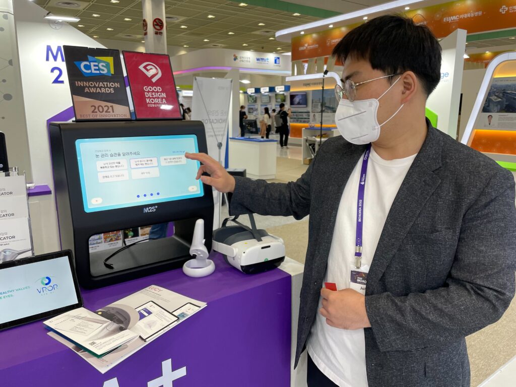 엠투에스는 VR로 눈 건강을 진단할 수 있는 ‘아이 닥터 VR’을 선보였다. 사용자가 헤드셋을 착용하면 눈 건강 상태를 추적해 결과를 보여준다. 시력이나 동체시력, 입체시력 등 총 11개 검사가 가능하다. ‘아이닥터’는 CES 2021에서 최고 혁신상을 받기도 했다.