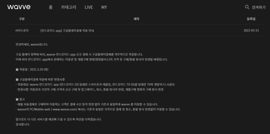 웨이브 또한 오는 29일부터 구글 인앱 결제 가입자에 한해 월정액 요금을 인상한다. 기존 베이직은 7900원에서 9300원, 스탠다드는 1만900원에서 1만2900원, 프리미엄은 1만3900원에서 1만6500원으로 올랐다. PC나 모바일 웹, 원스토어 등에서 이용할 때는 기존 가격 그대로이며, 기존에 정기결제하던 회원들도 영향을 받지 않는다.