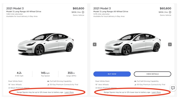 테슬라 홈페이지 모델3 소개 내용에는 “이 차는 2017년 초 제작된 배터리팩으로 만들어졌습니다. 이 팩은 차량 제작 당시 신품이었지만 셀이 오래돼 용량이 줄었고 현재 생산 사양보다 최대 12%까지 주행거리가 줄 수 있습니다”고 쓰여 있다.
