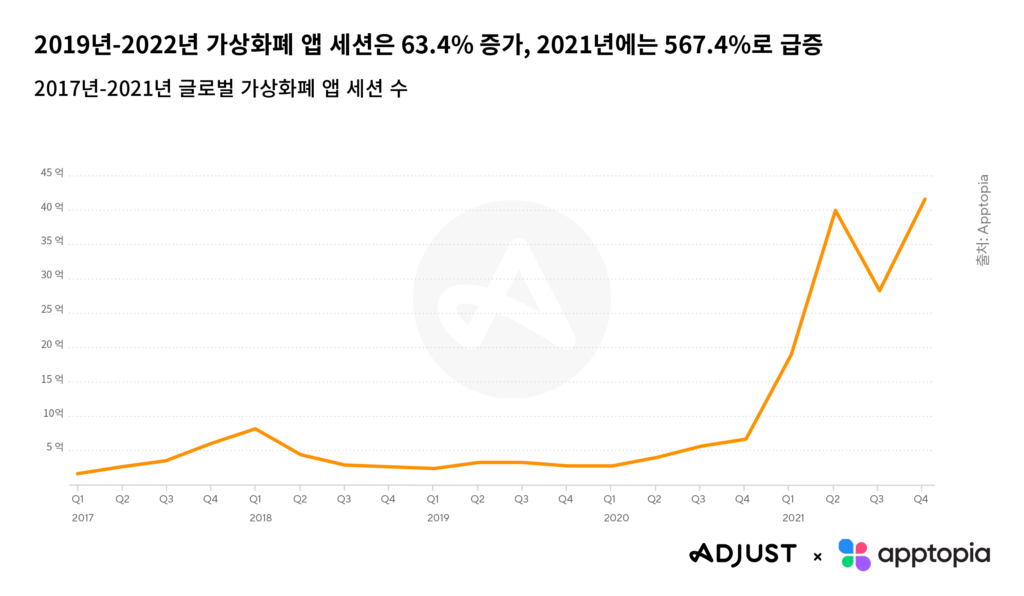 또한 가상자산 가치가 고점을 기록할 때 가상자산 앱의 설치 수와 세션 수 또한 증가하면서, 2019년에서 2020년 세션 수는 63.4% 증가(설치 수 증가 반영), 2021년에는 세션 수가 567.4% 증가했다.