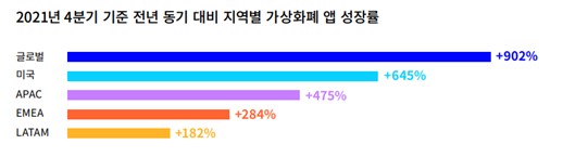 애드저스트의 리포트에 따르면 2021년 4분기 글로벌 가상자산 앱 사용률은 전년 대비 902% 급증했다. 순서대로 미국(645%), 아시아·태평양(475%), 유럽·중동·아프리카(284%), 라틴아메리카(182%) 지역에서 두드러진 성장을 기록했다.