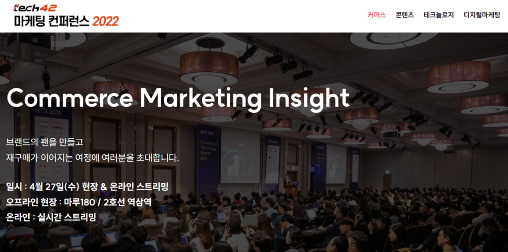 한편 이날 ‘커머스 마케팅 인사이트’ 행사는 테크42가 연간 기획으로 주최하는 ‘마케팅 컨퍼런스 2022’의 시작을 알리는 행사라는 점에서 의미가 남다르다. ‘마케팅 컨퍼런스 2022’는 이후에도 오는 6월 ‘디지털 콘텐츠 마케팅 인사이트’, 8월 ‘테크놀로지 마케팅 인사이트’, 11월 ‘디지털 마케팅 인사이트 2023’으로 이어지는 대장정에 돌입한다.