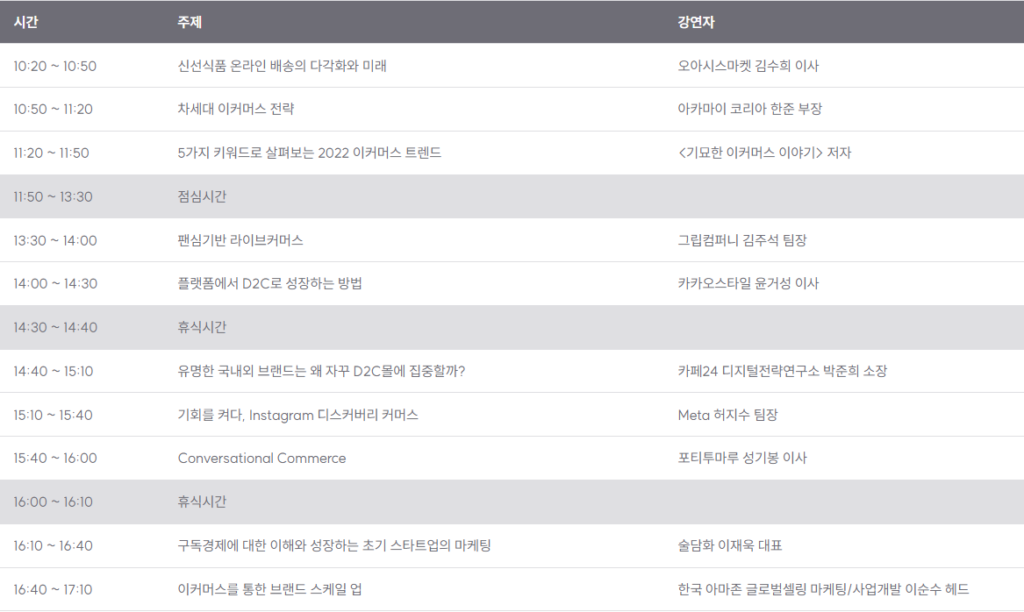 국내 커머스 업계 혁신을 이어가고 있는 기업의 현업 마케터이자, ‘기묘한 이커머스 이야기’ 저자인 기묘한 강연자의 ‘5가지 키워드로 살펴보는 2022 이커머스 트렌드’ 강연도 기대를 모으고 있다.