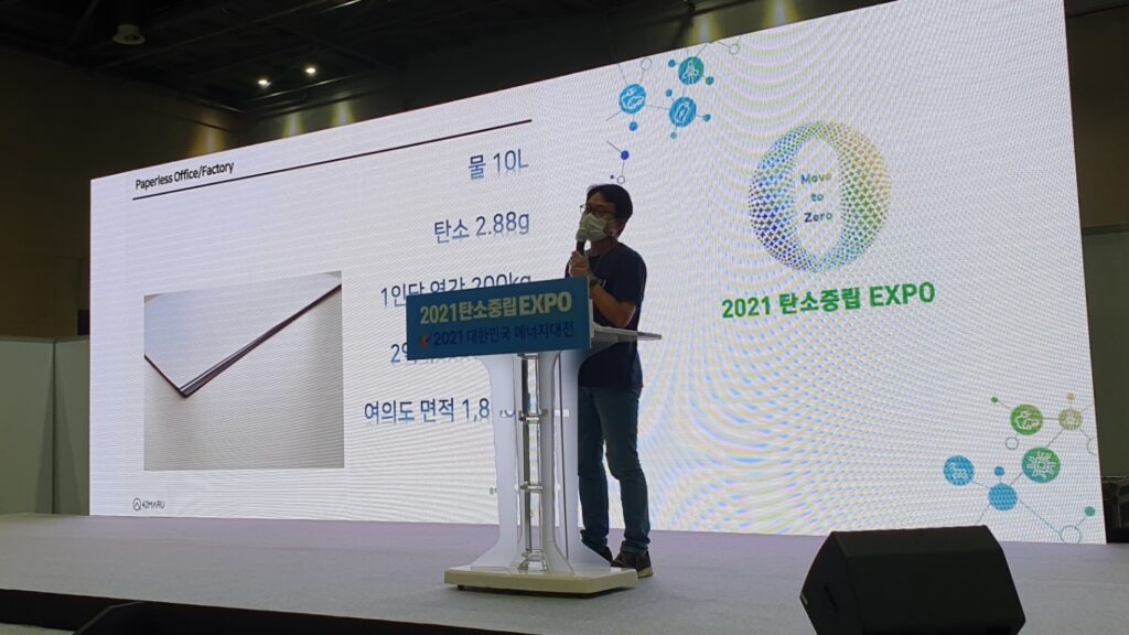 김 대표는 "A4 한 장에 물 10L와 탄소 2.88g이 필요하며, 우리나라의 경우 1인당 연간 200kg의 종이를 소비하는데 대부분 사무실에서 소비된다"라며, "AI 기반의 디지털 트랜스포메이션을 통한 페이퍼리스 오피스/팩토리 구현을 통해 이를 절감할 수 있다"고 말했다.