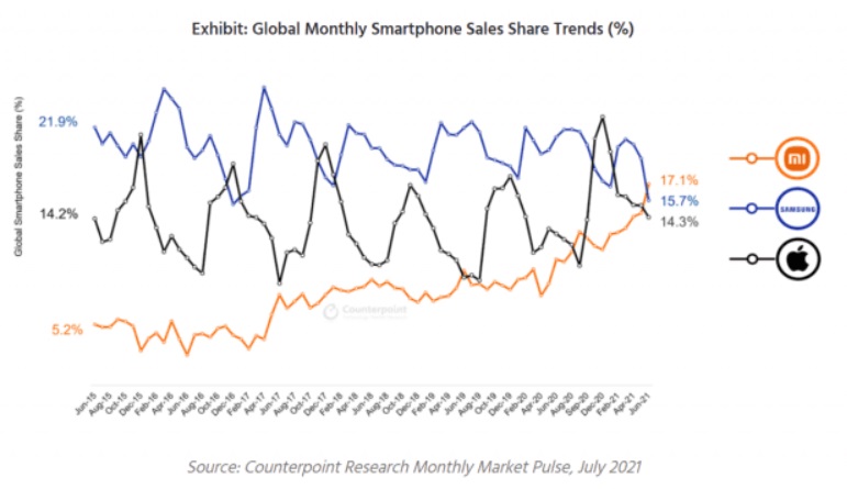 시장조사업체 카운터포인트리서치는 6일, 샤오미가 17.1% 판매 점유율로 지난 6월 글로벌 스마트폰 월 판매량 1위를 기록했다고 전했다. 2위는 삼성전자(15.7%)였으며, 3위는 애플(14.3%)이었다. 이 추세라면 샤오미가 삼성전자를 추월하는 것은 2023년 보다 더 빠를 수도 있다.