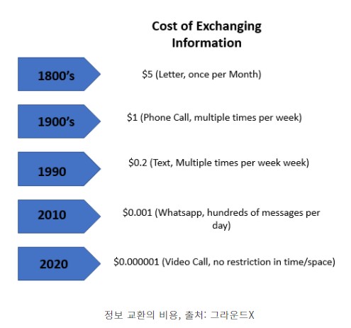 예를 들어, 위 이미지는 그라운드x의 한재선 대표가 “블록체인 생태계 현장” 강연 발표에서 이야기했던 내용이다. 메일에서 전화, 이메일, 문자, 카톡에 이르기까지 정보 전송 비용은 점점 더 저렴해졌다. 정보 교환 비용이 낮아졌다는 것은 정보를 받기가 훨씬 더 쉽다는 것을 의미하며, 저렴한 비용으로 인해 우리가 하루에 수신하는 정보의 양은 급증했다. 오늘날 우리는 다양한 매체(PC, 모바일 등)를 통해 다양한 형태의 정보(텍스트, 비디오 등)를 즐기고 있으며 이러한 변화의 영향에 대해 더 강조할 필요는 없다고 생각한다.