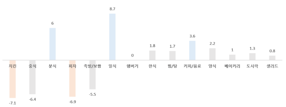 오픈서베이 배달 서비스 트렌드 리포트 2021 中 음식 카테고리 작년 대비 증감