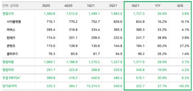 사업 부문별 매출액은 △서치플랫폼 8249억원 △커머스 3803억원 △핀테크 2417억원 △콘텐츠 1841억원 △클라우드 962억원이다.