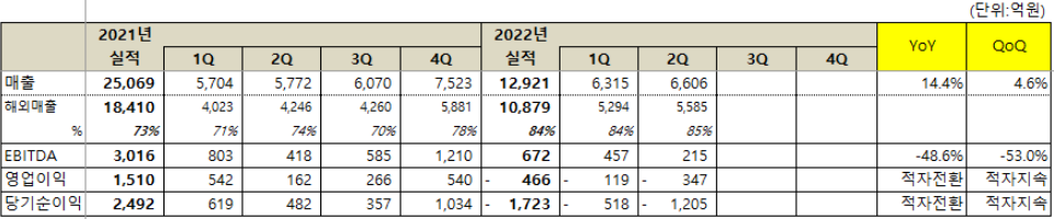 2022년 상반기 누적으로 보면 매출은 1조2921억원(YoY 12.6%), EBITDA(상각전 영업이익) 는 672억원(YoY -45.0%), 영업손실은 466억원(YoY 적자전환), 당기순손실은 1723억원(YoY 적자전환)으로 집계됐다.