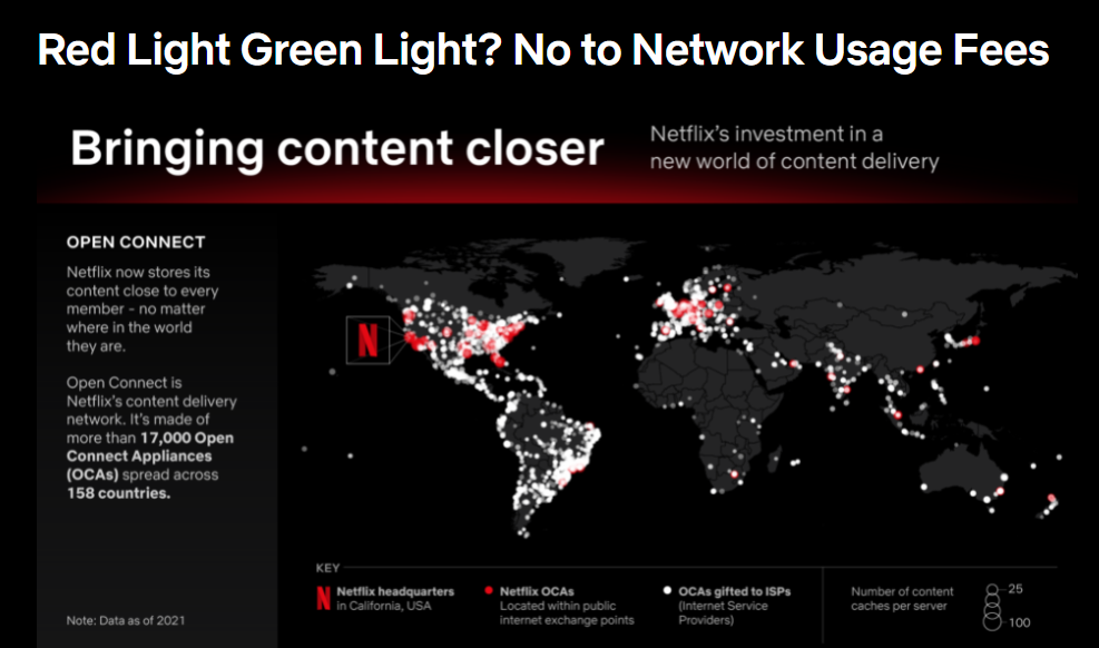 그는 “전 세계 1000여곳이 넘는 ISP가 오픈 커넥트의 혜택을 인식하고 있지만, 한국에서 가장 큰 ISP 중 한 곳은 이를 외면하고 있다”며 “비용 절감액이 2020년에만 12억 달러(약 1조 4000억원)으로 추산되는 오픈 커넥트를 받아들이지 않는 거은 콘텐츠 제공자(넷플릭스)와 인터넷 사용자 양쪽 모두에게 비용을 받아낼 수 있기 때문”이라며 국내에서 제기되는 이통사의 과도한 요금 문제까지 언급하고 나섰다.