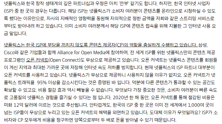 그는 글을 통해 “한국 인터넷사업자(ISP) 중 한 곳을 제외하고는 넷플릭스와 한국 창작 생태계의 깊은 파트너십과 우정은 ‘깐부’ 같다”며 “한국 소비자들에게 콘텐츠를 인터넷으로 시청할 수 있도록 했다는 이유만으로 해당 ISP는 시장 지배력을 동원, 넷플릭스와 같은 스트리밍 서비스로부터 자의적으로 정한 금액을 받아내려 하고 있다”고 작심한 듯 입장을 밝혔다.