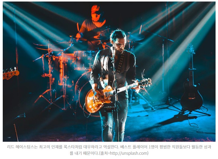 록스타 원칙은 베스트 플레이어 1명이 평범한 직원들보다 월등한 성과를 낸다는 거예요. 산타모니카 한 실험실에서 이뤄진 유명한 연구가 있어요. 실험 설계자들은 프로그래머 9명 중 최고 기량을 갖춘 사람이 평범한 사람들보다 2~3배 높은 성과를 낼 것으로 예상했어요. 하지만 결과는 전혀 달랐죠. 최고 프로그래머가 코딩에서 20배, 디버깅에서 25배, 프로그램 실행에서 10배 더 빨리 과제를 처리했어요. 이후 여러 사례를 통해 베스트 프로그래머의 가치가 보통보다 10배가 아닌 100배 이상으로 확인됐습니다. 심지어 빌 게이츠는 위대한 소프트웨어 프로그래머는 평범한 프로그래머보다 1만 배 이상의 값어치를 한다고 말하기도 했죠.