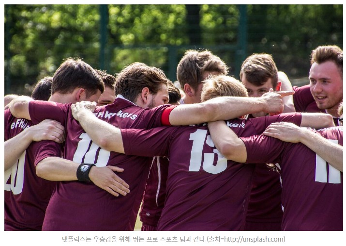 그래서 넷플릭스를 프로 스포츠팀으로 규정합니다. 위대한 팀은 뛰어난 기량을 갖춘 선수들만으로 부족합니다. 그들이 내는 하모니와 시너지가 필요합니다. 서로 신뢰하고 협업할 줄 알아야 합니다. 이를테면 프로축구 선수들이 자신의 욕심만 앞세우면 승리할 수 없죠. 언제 패스를 해야 하고 언제 과감하게 돌파해야 할지 알아야 합니다. 팀이 이길 때만 내가 이긴다는 사실을 인정해야 하는 겁니다. 한마디로 넷플릭스는 우승컵을 위해 뛰는 프로 스포츠 팀과 같습니다.