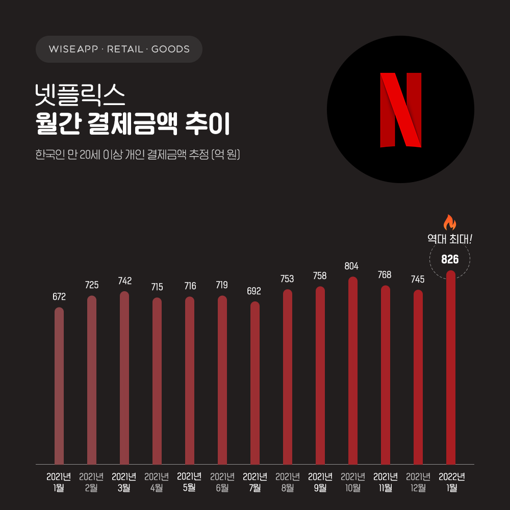이는 앱/리테일 분석서비스 와이즈앱·리테일·굿즈가 지난해 11월 ‘넷플릭스(NETFLIX) 요금 인상 이후 한국인의 넷플릭스 결제금액, 유료 결제자 추정치를 분석한 자료를 통해 확인됐다.