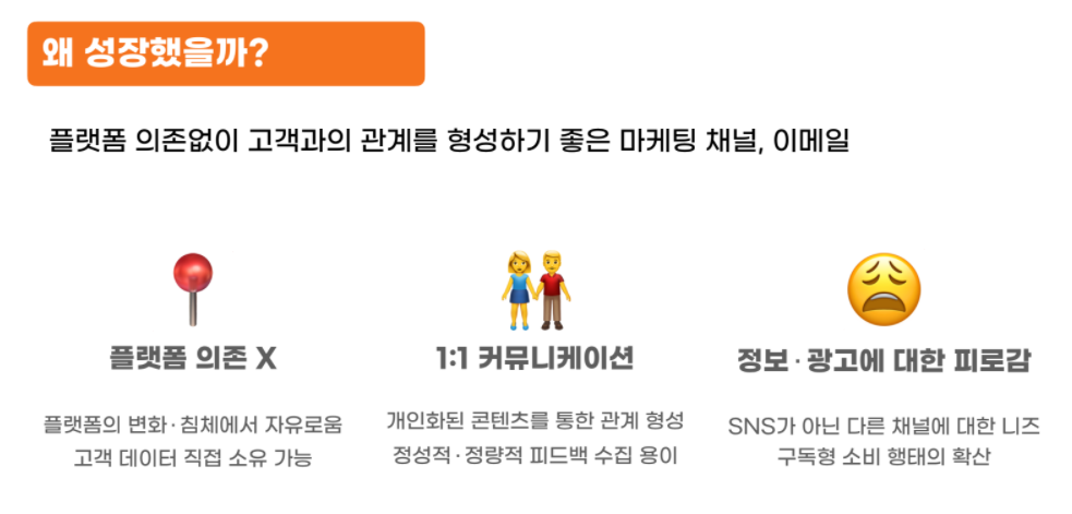 게다가 무수히 많은 앱과 플랫폼이 범람하는 상황에서 플랫폼 의존적이지 않은 뉴스레터의 특징은 새삼 장점으로 인식되고 있다. 모바일이든 PC든 수시로 화면을 채우는 광고 피로도도 없다는 것 역시 뉴스레터가 다시금 선호되는 이유다.