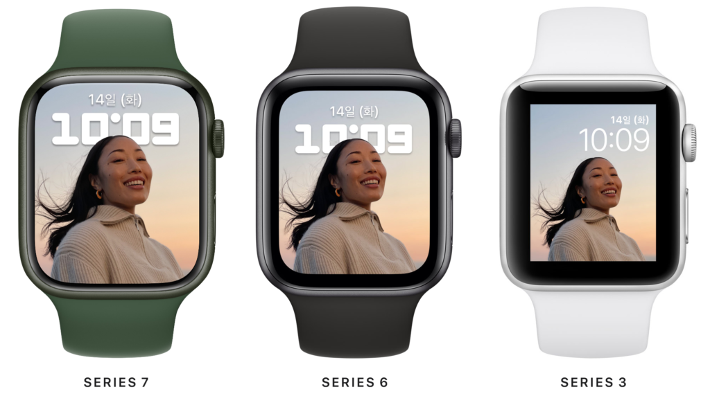 애플이 14일(한국 시간으로 15일 2시) 새로운 애플워치7 시리즈를 공개했다. 새로운 애플워치의 가장 큰 특징은 디스플레이의 확장이다. 애플워치7의 디스플레이 주변 베젤은 1.7mm로 얇아졌다. 베젤을 줄여 전작인 애플워치6 시리즈보다 화면 영역이 약 20% 커졌다.