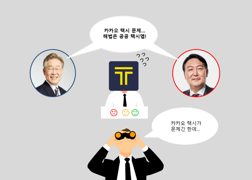 공통점은 두 후보 모두 카카오 택시를 타깃으로 하고 있다는 것이다. 다만 공공 택시앱과 관련한 양당 후보들의 발언을 살펴보면 조금은 결이 다른 것을 발견할 수 있다.