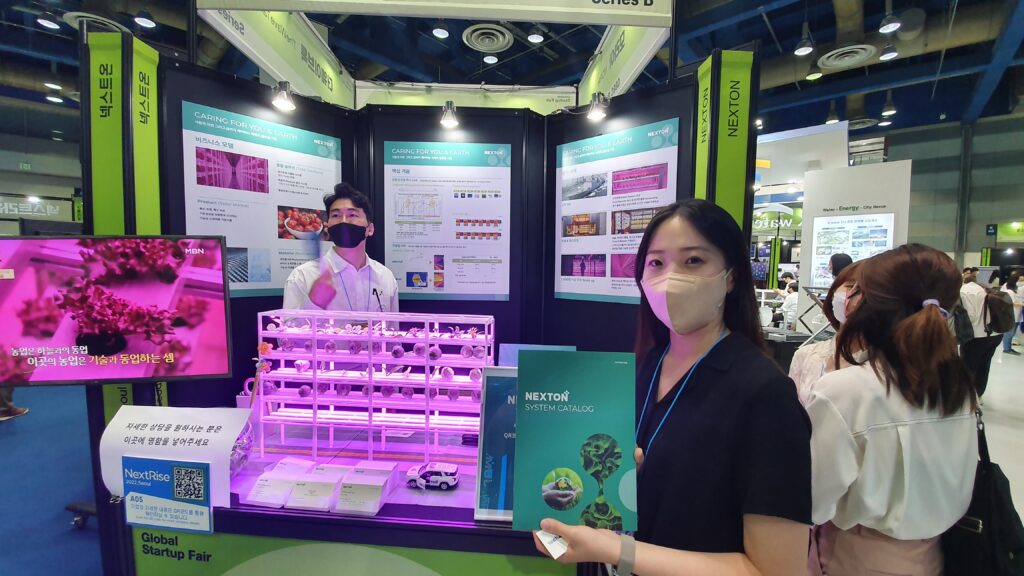이번 행사에서 보라 빛으로 빛나는 넥스트온의 재배모듈 모형은 많은 관람객의 관심을 끌고 있다. 넥스트온은 인도어 팜 기술 뿐 아니라 세계 최대 규모의 인도어 팜을 실제 운영하며 저온딸기 등의 작물을 양산해 공급하는 사업도 병행하고 있다. 기술기업이자 식자재 생산 기업이기도 한 셈이다.