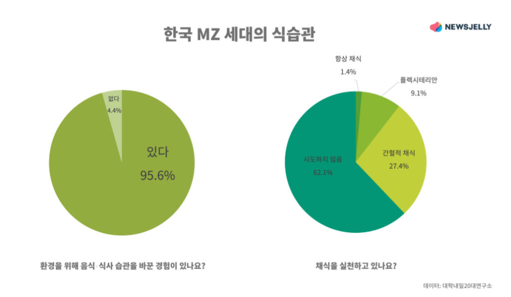 ‘간헐적 채식을 실천하고 있다’는 응답이 나올 만 한 질문은 ‘채식을 실천하고 있나요?’일 거예요. ‘항상 채식을 실천한다’, ‘채식을 실천하지 않는다’와 같은 항목이 있었을 거고요. 그다음은 ‘환경을 위해 음식・식사 습관을 바꾼 경험이 있나요?’가 질문이 되고 ‘있다’, ‘없다’로 나뉘지 않았을까요?