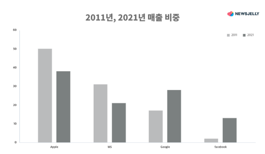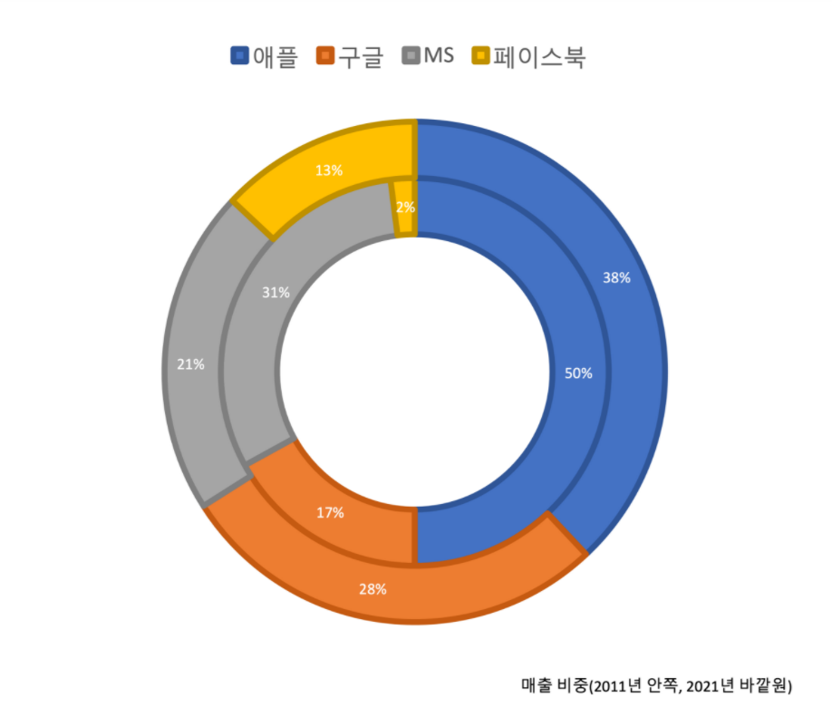 애플, MS(마이크로소프트), 구글, 페이스북의 매출 비중을 비교한 막대차트입니다(제작: DAISY Basic)