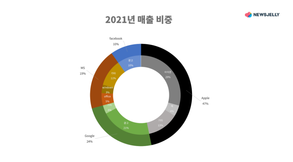 미국 IT 기업의 매출 비중과 세부내역을 담은 이중도넛차트입니다