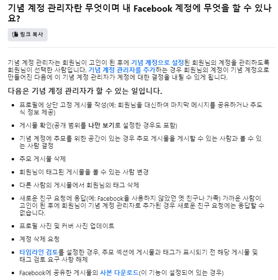 메타 역시 자사가 운영하는 페이스북에 계정 관리자를 지정하게 하는 정책으로 디지털 유산을 인정하고 있다.