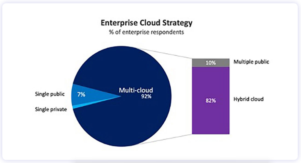 실제로 소프트웨어 기업 플렉세라 Flexera의 2021년 클라우드 현황 보고서 Flexera 2021 State of the Cloud Report에 따르면, 임직원 1,000명 이상의 기업 750여 곳 중 92% 가 멀티 클라우드 Multi cloud전략을 채택했으며, 이중 82%는 프라이빗 클라우드 Private cloud와 퍼블릭 클라우드 Public cloud를 혼용하는 하이브리드 클라우드 Hybrid cloud 형태의 환경을 사용하고 있는 것으로 나타났다. (Flexera, 2021)