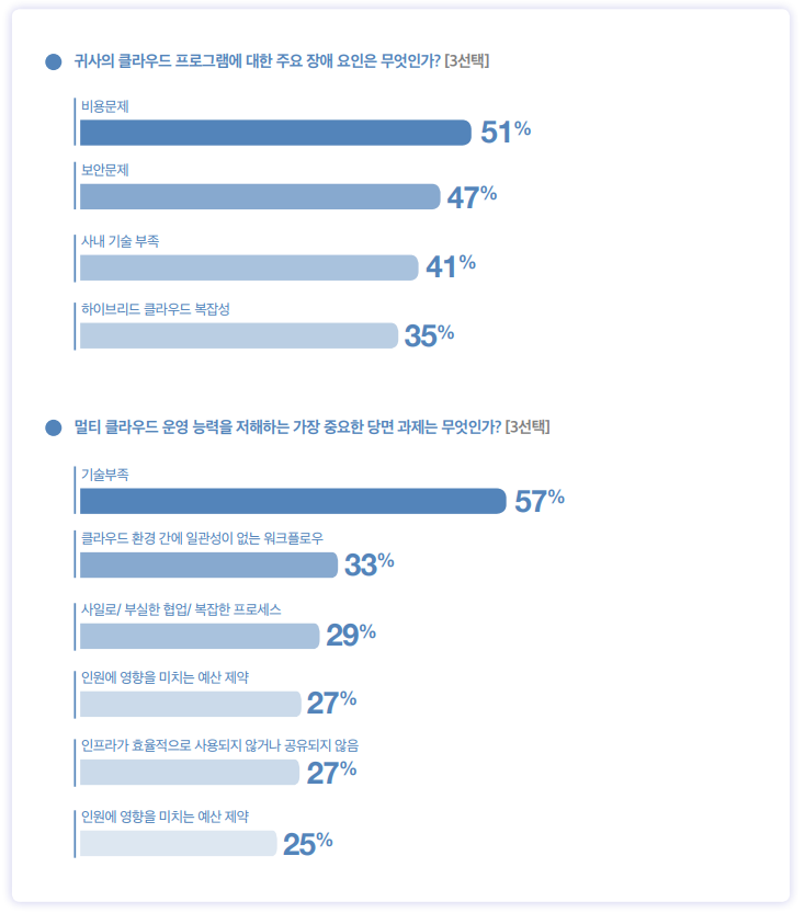 또한, 클라우드 환경, 특히 멀티 클라우드 환경에서는 비즈니스 목표 달성을 위해 여러 부문에서 여전히 해결해야 할 과제들이 존재하는 것으로 나타났다.