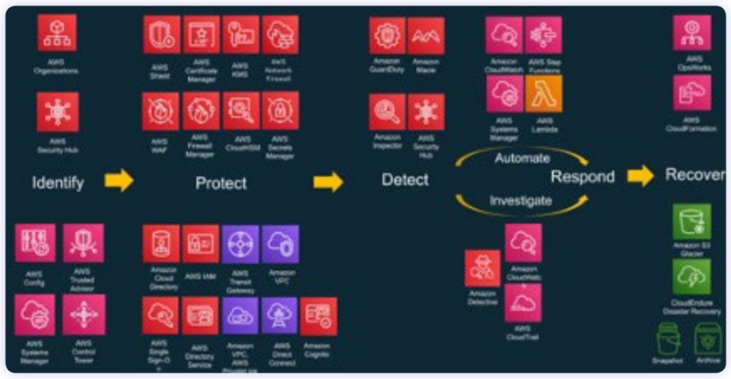 이때 각각의 보안 서비스를 그룹화하거나 연결하는 방식은 클라우드 제공자 별로 조금씩 다르지만 유사하며, AWS의 경우 미국 국립표준기술연구소NIST의 사이버 보안 프레임워크에 따라 서비스를 분류 및 연결하고 있다. 이 프레임워크의 핵심은 앞서 언급한 표준 지침들을 ▲ 식별 Identify4 , ▲ 보호 Protect5 , ▲ 탐지 Detect6 , ▲ 대응 Respond7 , ▲ 복구 Recovery8 그룹으로 구분하고 각 활동을 정의한 것으로, 실제AWS의 보안 서비스를 확인해 보면 아래 그림과 같이 구분하고 있다.