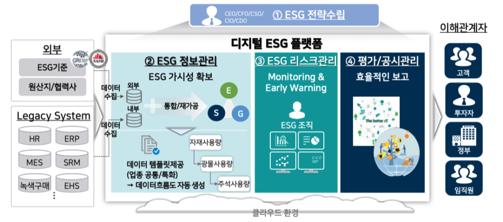 국내 SI 1위 업체인 삼성SDS는 자체적으로 발간하는 지속가능경영보고서를 통해 기업의 ESG 경영과 평가 프로세스를 디지털화한 플랫폼을 준비 중이라 전했다. ESG 플랫폼은 전략 수립, 정보 관리, 기업 활동 모니터링, 과제 관리, 공시 관리 등 기업이 수행하는 모든 ESG 데이터를 정량화해 관리할 수 있도록 지원한다.