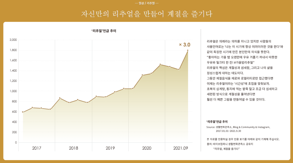 “저희가 진행하는 트렌드 분석은 신탁(神託)적인 것이 아니예요. 그야말로 데이터를 바탕으로 끌어내는 작업이죠. 그런 것을 바탕으로 루틴과 리추얼이 중요해지고 있다는 것을 감지했죠. 처음에는 데이터를 바탕으로 한 트렌드 예측이었지만 이제는 일반화돼 있어요. 이제는 조직이 함부로 개인의 시간을 터치할 수 없죠. 제도적으로는 주 52시간제도 크게 영향을 미쳤고요. 코로나19로 인해 재택을 하게 되고 모임을 할 수가 없게 된 상황도 개인에게 이전과 다른 시간을 부여하고 있어요. 그렇다고 해서 밀레니얼 세대나 젠지(Gen Z)세대가 여유 있게 시간을 보내진 않아요. 굉장히 열심히 살죠. 그런 성향이 어떻게 시간을 알차게 쓸 것이냐로 이어지며 편리함을 찾는 도구에 대한 관심이나 ‘미라클 모닝’과 같은 챌린지로도 나타나고 있고요.”