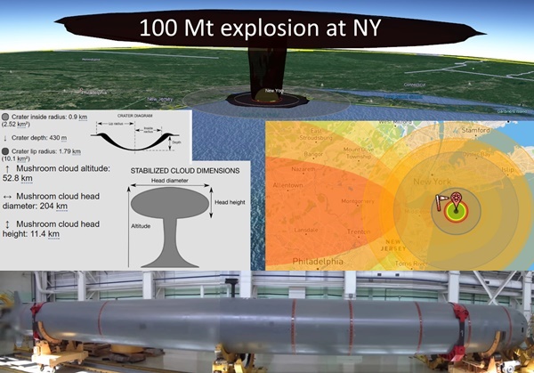 러시아가 개발한 것으로 추정되는 핵어뢰인 ‘상태 6(Status-6)급 해양 다목적 시스템’(Status-6 Ocean Multipurpose System)(아래)과 폭발 위력(위). 9사진=위키피디아)
